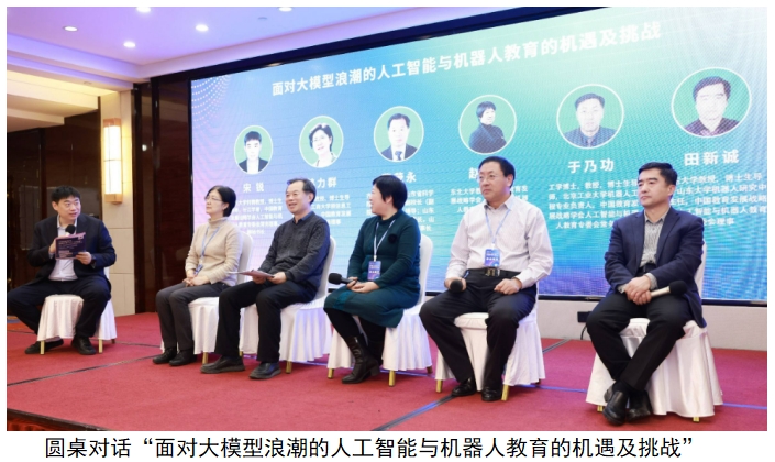 本次論壇上,來自山東大學(xué)、北京工商大學(xué)、齊魯工業(yè)大學(xué)、東北大學(xué)、北京工業(yè)大學(xué)的宋銳教授、田新誠教授、韓力群教授、曹茂永教授、趙姝穎教授、于乃功教授在主題為“面對大模型浪潮的人工智能與機(jī)器人教育之機(jī)遇及挑戰(zhàn)”的圓桌對話環(huán)節(jié),圍繞“以大模型為代表的AI工具對基礎(chǔ)教育有何影響?”、“大模型的快速發(fā)展將對人工智能教育的內(nèi)容和方法、手段帶來哪些變革?作為教育工作者我們該如何應(yīng)對?”、“大模型對機(jī)器人技術(shù)有何影響?機(jī)器人工程、智能制造工程等新工科專業(yè)應(yīng)該如何應(yīng)對?”、“大模型對于學(xué)生與老師之間的角色定位將產(chǎn)生何種影響? 如何更好地發(fā)揮它的作用?”、“大模型的快速發(fā)展對高校專業(yè)建設(shè)與人才培養(yǎng)將產(chǎn)生哪些影響?”等問題展開了深度研討,專家們從各個(gè)角度集思廣益、各抒己見,為人工智能助力人才培養(yǎng)及促進(jìn)教學(xué)模式創(chuàng)新發(fā)展獻(xiàn)計(jì)獻(xiàn)策。