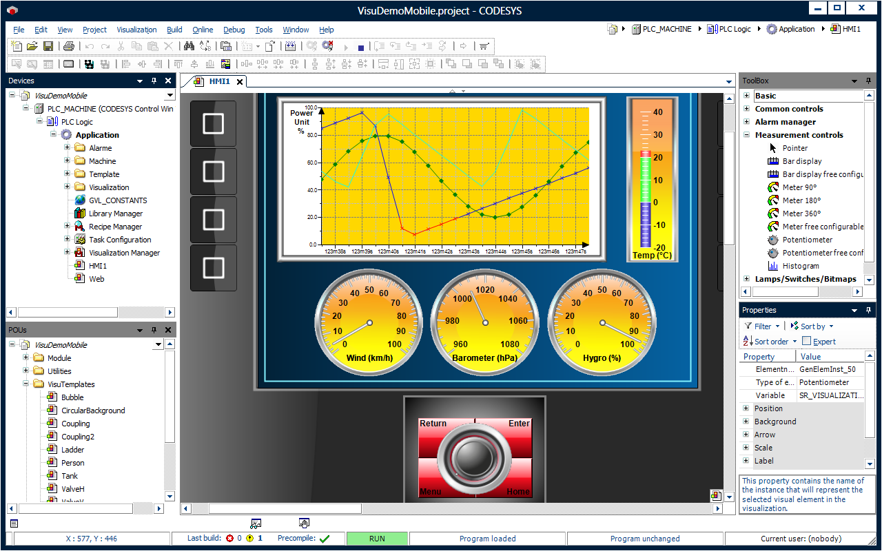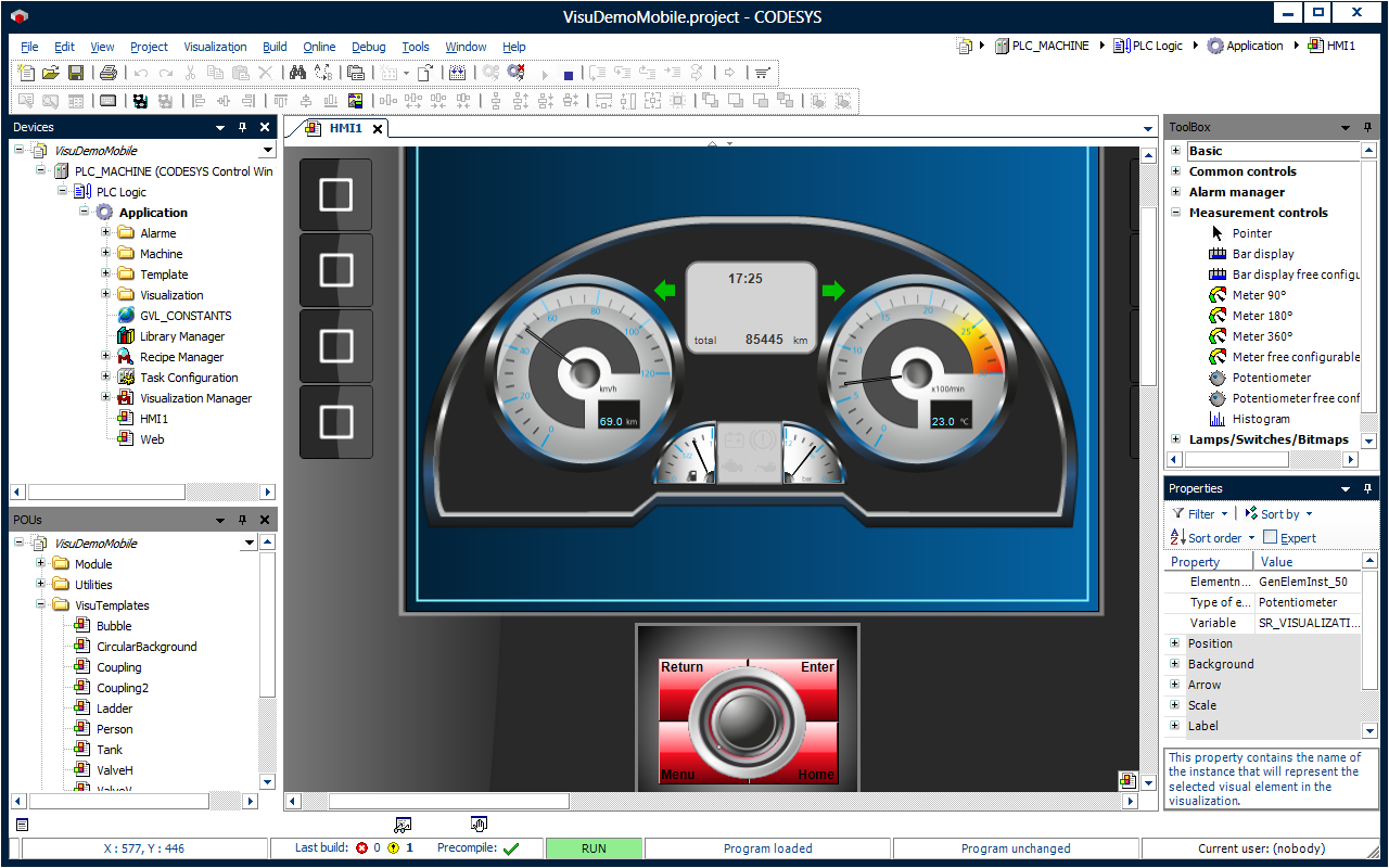 基于IEC 61131-3標(biāo)準(zhǔn)的CODESYS開發(fā)系統(tǒng)中包含了集成化的可視化編輯器,可以在PLC 開發(fā)系統(tǒng)中直接創(chuàng)建顯示在目標(biāo)設(shè)備、PC或Web 瀏覽器上的專業(yè)可視化界面。在過去十年中,CODESYS可視化已經(jīng)在全球數(shù)以千計(jì)的工業(yè)機(jī)器和應(yīng)用開發(fā)中得到證明。在CODESYS中創(chuàng)建的可視化界面可以顯示在配備有CODESYS TargetVisu的控制器上,無需任何其他硬件,可視化界面直接顯示在控制器的內(nèi)置或外置顯示器上。